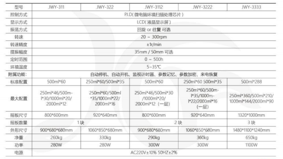 用于抗生素的微生物是耗氧菌,在培养过程中,必须连续提供氧气(空气),否则微生物不能更好的生长和合成抗素。因此,在利用摇床培养微生物时,摇床的偏心距和转速是影响微生物生长和合成抗生素的重要因素之一。JWY 系列摇瓶机适用于大批量生产作业和生物制药研究应用领域中试及大批量菌种筛选提供了最高水平的振荡效率,而且具有很强的经济性和实用性。