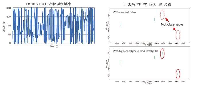 这些高速、高精度数字控制技术为满足各种要求提供了最佳解决方案,有助于实现宽范围的高级核磁共振测试。 如果观察到的原子核有宽范围的化学位移,例如 19F,一些信号可能由于常规矩形脉冲的带宽有限而无法观测到。 在这种情况下,高速相位调制脉冲激发的范围更广,非常有用。